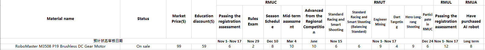If we register for both RMUC and RMUL, is the number of items available for purchase at a discounted level listed in “Appendix I Accessories” additive? For the M3508, for example, after passing the RMUC and RMUL registration assessments, would we be able to purchase 18, 12, or 6 M3508’s at a discounted price? For reference, the row in the appendix for the M3508 is shown below.