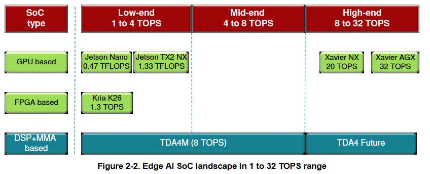 - You can’t simply “add up their performance” and get a number to compare with the Jetson GPU. Each of them does different kinds of things, so you’re e.g. probably only going to be using the “deep learning accelerator” (TPU) for ONNX machine learning inference. The dedicated GPU and “vision” accelerator probably aren’t very useful for running a machine learning model. (Note: an NVIDIA GPU supports lots of general-purpose computations, but many GPUs are just dedicated to graphics. The reference manual for the TDA claims some general-purpose abilities but I’m doubtful of software support.) So while the Jetson GPU is general-purpose, the various accelerators in the TDA processor each have their own place and aren’t interchangeable.
